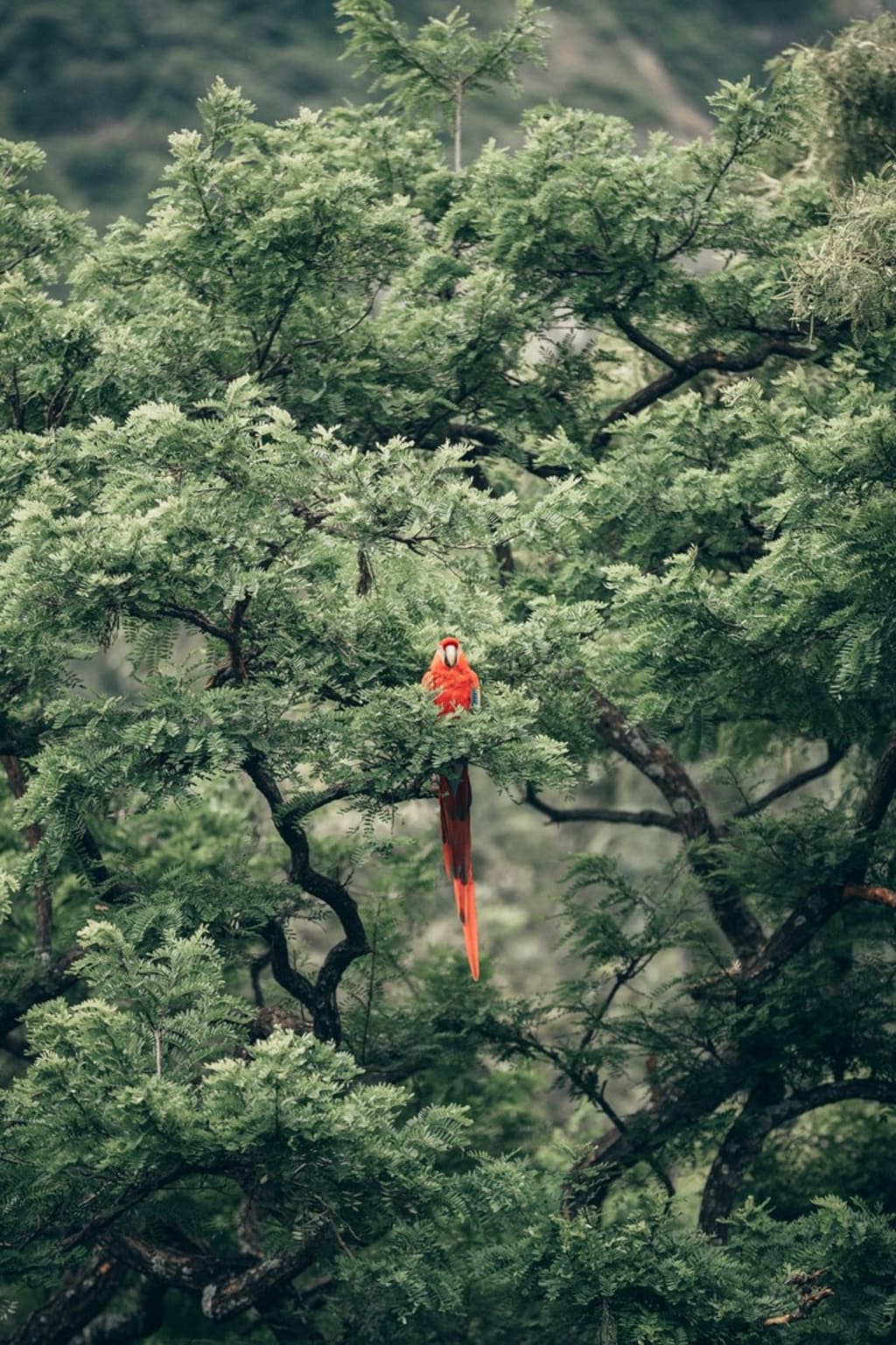 We fly blue and green and red to match the river, and leaves, and violence. Sometimes we fly with dozens but usually it’s just us two. So in love, we fly in sync with our wings spread almost close enough to touch. In the day and night, it stays hot and the breeze that ruffles our feathers is cool. We hear some of their words whispering on the winds. Their language is Portuguese. Ours, Macaw. I hope one day we can communicate but for now we understand each other. The man and woman love each other and their girl, and they need a home. My love and I are the same.