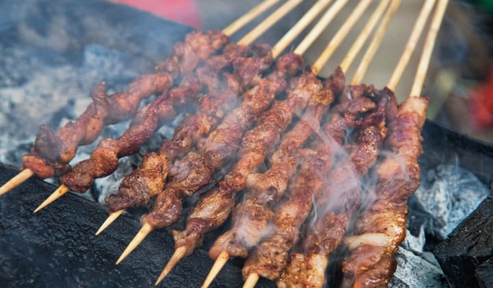 Yakitori: Yakitori is a Japanese dish that consists of grilled skewered chicken, often flavored with soy sauce, sake, and other seasonings. It is a popular street food and is often served in izakayas (Japanese pubs).