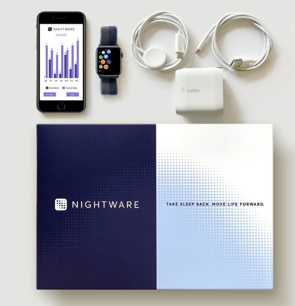 NightWare is a digital therapy system that works together with the Apple Watch and iPhone to stop the nightmares associated with post-traumatic stress disorder. 1 Only with a prescription is this medication available.It's also the first and only digital therapy designed specifically for treating nightmares that has been approved by the FDA. 2 NightWare uses information from the Apple Watch heart rate sensor as well as the accelerometer and gyroscope to detect a nightmare and then interrupt it with tactile feedback, which produces gentle pulses that are triggered on the wrist and gradually increase to the point that the patient is freed from the nightmare but not asleep.