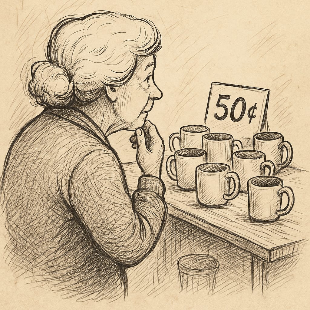 I still think of her whenever I see a white-haired lady in curlers, a flea market haggler talking someone down to a quarter, or a chipped coffee mug with that familiar brown ring. I hear her voice when I pass up something I don’t need, or when I catch myself folding a fitted sheet the way she taught me, snapping the corners together just so. In those moments, I feel her presence - a reminder that she once held us together with equal parts love, stubbornness, and sheer will.