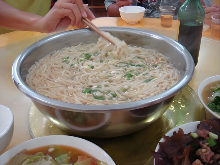 When the leader of the armed forces department heard this, he came over to ask about the situation. The expression on the landlady's face was so funny. She said, "You guys can really eat! I had two rice cookers full of rice, and it's all gone." The leader of the armed forces department asked, "How long will it take to cook the rice now?" The landlady glanced at the clock on the wall and said, "It'll take more than 20 minutes." When the leader heard this, he thought, "Can we wait for 20 minutes?" Then he said, "Make noodles instead." The landlady quickly went to the kitchen, and after a while, she brought out another big basin of noodles in meat soup.