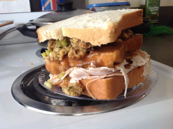 - Grab one slice of bread with the cranberry sauce and put the turkey on top, than layer your moist maker which is your soaked gravy bread, top it off with the stuffing and than put your last piece of bread with the cranberry sauce on top.