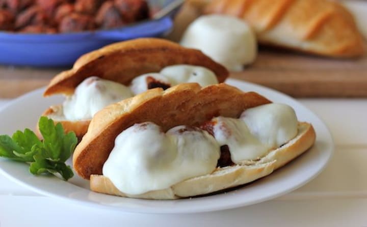 - To assemble the sandwich, place 3-4 meatballs and a spoonful of marinara into each baguette. Top with sliced mozzarella and place into oven and bake until the cheese has melted, about 5 minutes.