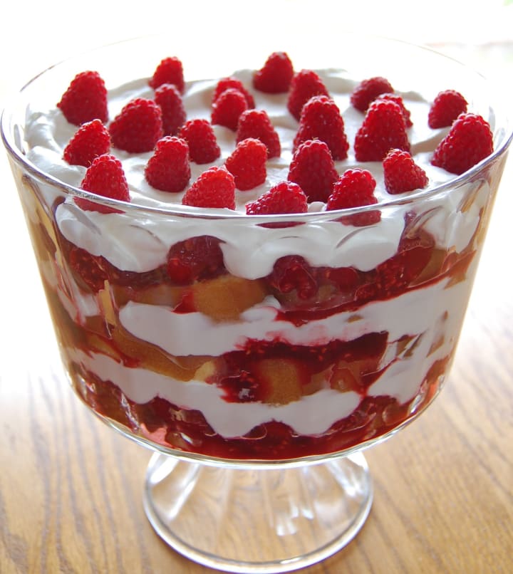 - Fit ⅓ of slices snugly in the bottom of a 4-quart trifle dish or other glass bowl, trimming edges if necessary. Spread top of layer with ⅓ of raspberry mixture, and then ⅓ of whipped cream. Repeat to make two more layers; garnish with remaining cup raspberries. Refrigerate until ready to serve, up to 24 hours.