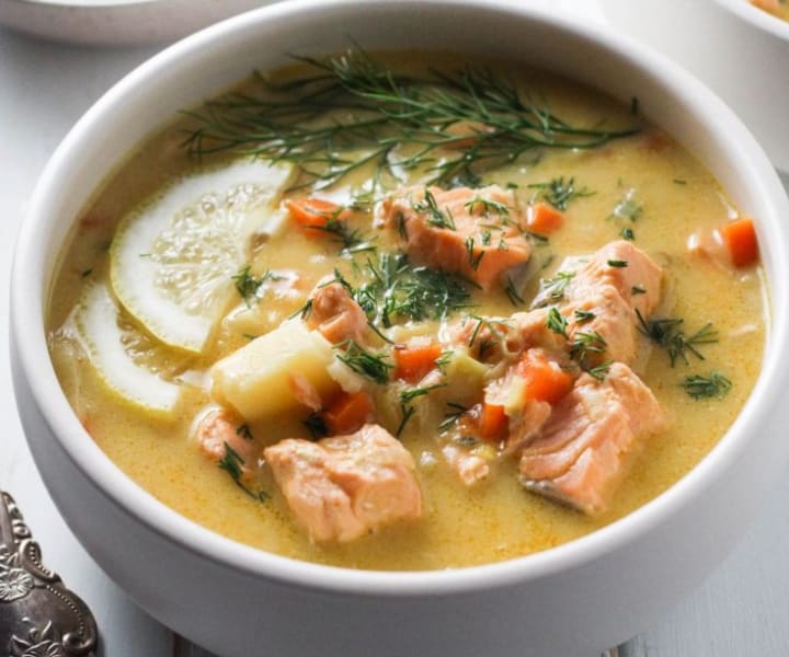Lokikeitto is a creamy Finnish salmon soup called laxsoppa in Sweden. The soup is prepared with chunks of salmon fillet, diced potaoes, and carrots cooked in a buttery broth with fish stock and cream. It is a comforting winter dish seasoned with dill and served with buttered rye bread or lemon wedges.