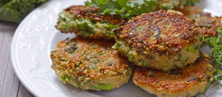 The patties also include onions, garlic, and spices. Then they're shaped into thick, round patties, breaded and pan-fried until crispy and golden brown.