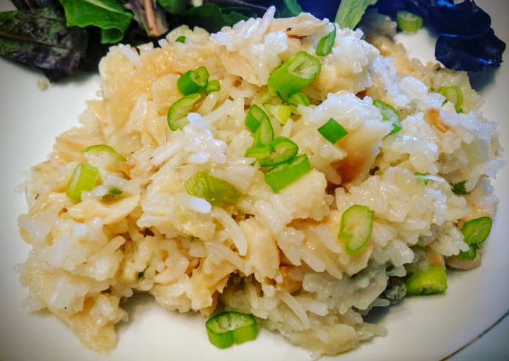 Arroz de bacalhau is a Portuguese dish prepared with salt cod, rice, sauteed onions, garlic, olive oil, tomatoes, peppers, water or vegetable stock and white wine.