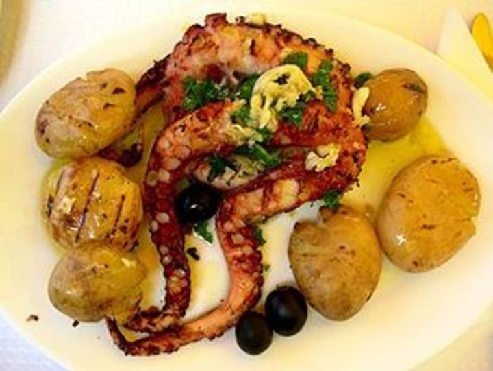Polvo à Lagareiro is a classic Portuguese dish and the name lagareiro means to use a cooking style that has many varieties. The fish is roasted or grilled with extra virgin olive oil. Using different seafood can include boiled octopus, cut into pieces, grilled and brushed with olive oil. The dish is topped with a combination of garlic, coriander, lemon juice, and salt. It is usually served with small roasted unpeeled potatoes.