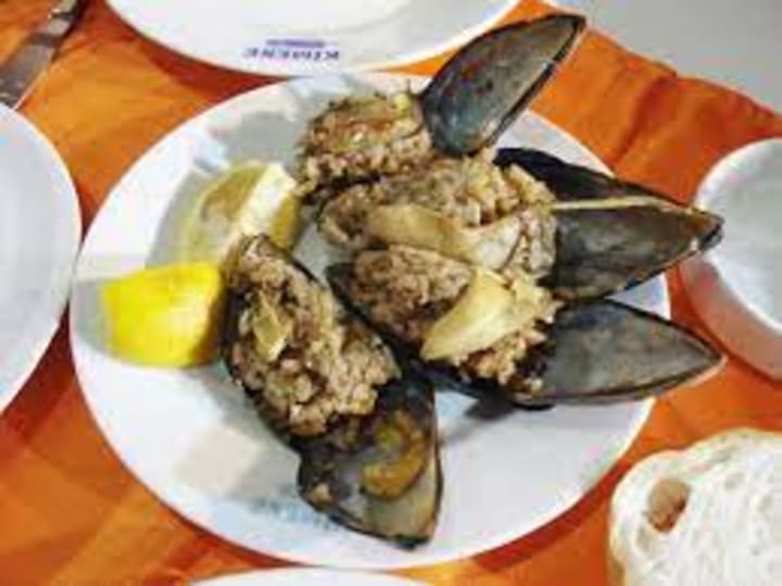 Midye dolma is a popular Turkish street food that is prepared with mussels filled with an aromatic blend of rice, herbs, nuts, and spices like pine nuts, raisins, saffron, black pepper, cinnamon, red pepper flakes, parsley, and dill. When eating midye dolma the top shell is gently broken and lemon juice is squeezed over the filling. Typically the filling is eaten using the loose shell as a spoon.