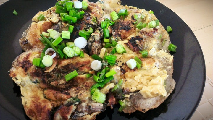 Oyster omelet is prepared with small oysters that are combined with potato starch and egg batter. A dash of spicy chilli sauce can be mixed with lime juice to give the dish more flavor.