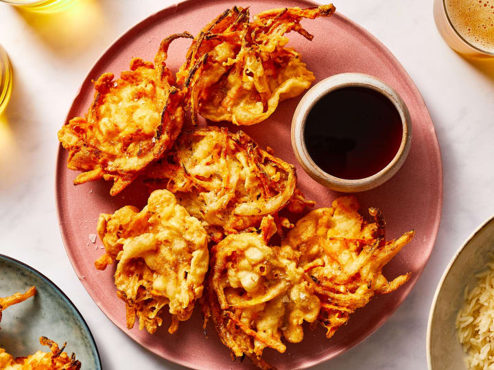 Kakiage is a tempura variety using flour and water and sometimes egg yolks to create a light coating and make it a crispy snack. Kakiage is a combination of thinly sliced vegetables like carrots, onions, lotus roots, and sweet potatoes along with small pieces of seafood. It can be eaten on its own or accompanied by dipping sauces and even used are a topping for noodles or rice.