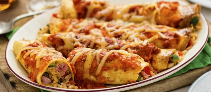 Enchiladas de camaron is a popular Mexican dish that is prepared with fried tortillas filled with shrimp and corn, onions, chillies, tomatoes, and coriander. The tortillas are rolled and are especially popular in the North Pacific and Gulf regions of Mexico. They can be garnished with crema Mexicana, avocado slices and grated cheese.