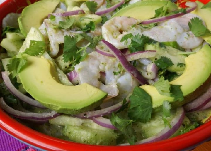 Usually it is served right after coating the shrimp in lime juice and accompanied by avocados and tostados. The beverage of choice is beer or tequila.