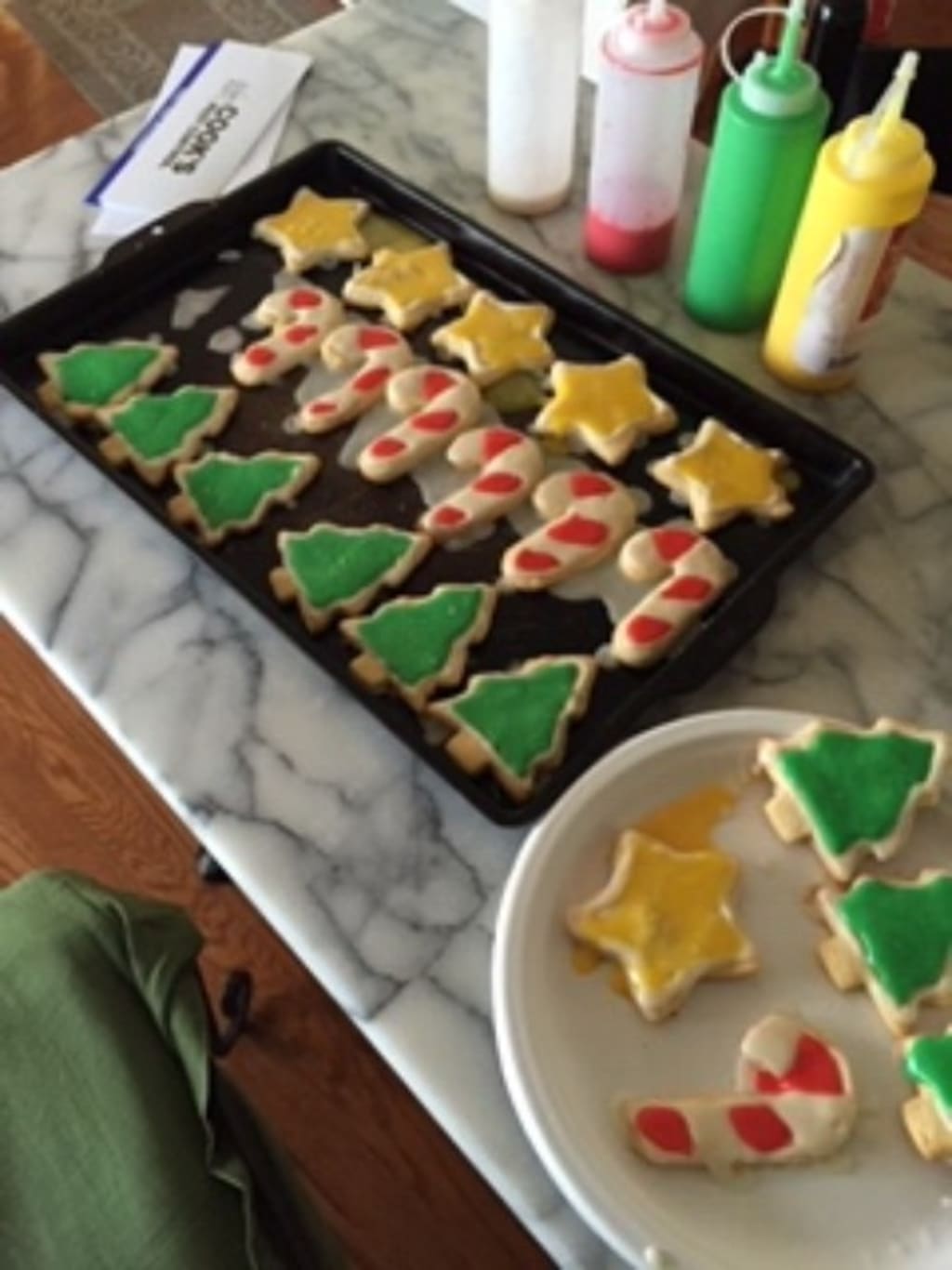 To begin, you need to sift the cake flour, baking powder, and salt onto a piece of parchment paper or into a medium bowl. (I prefer to use the bowl as it is less messy and I am notorious for a messy kitchen even with the best tips.) Set the mixture aside. Beat the butter and sugar in a large bowl with a mixer on medium-high speed until light and fluffy, for about 5 minutes. Add the egg and vanilla and beat until incorporated. Reduce the mixer speed to low and beat in the flour mixture in 2 batches until just completely incorporated. Divide the dough between 2 pieces of plastic wrap and shape into disks. Wrap and refrigerate until firm, usually at least 1 hour. Next, you will line 2 baking sheets with parchment paper so that your cookies can be removed easily without leaving half the cookie behind. Working with 1 disk of dough at a time, roll it out on a floured surface, dusting with flour as needed, until approximately 1/8 of an inch thick. Cut out shapes with 2-4 inch cookie cutters. (I like to visit Hobby Lobby and Michael's for the cookie cutters - they are usually on sale for all of November and December and they have just about every holiday image you can imagine.) Arrange the cookies 2 inches apart on the prepared baking sheets. If the dough is too flimsy, return to the refrigerator. Chill the cutouts for at least 30 minutes. Finally, to cook them, you will position racks in the upper and lower thirds of the oven and preheat it to 350 degrees F. Bake, switching the pans halfway through, until the cookies are slightly puffed and just barely golden, usually about 13-15 minutes, but keep a close eye on the oven. Let cool 10 minutes on the baking sheets before transferring to a decorating station. Once transferred, let the cookies cool for at least 45 minutes before icing. This is crucial or your cookies will come out a messy glob of goop!