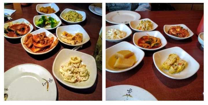 First comes the side dishes while you wait for your appetizers or main course. These are small dishes that are usually served cold or at room temperature. They are also rarely ever the same when I return.
