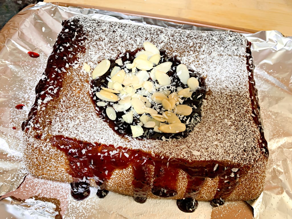 - Once you have done this, sprinkle some powdered sugar on your cake and then, sprinkle the remaining flaked almonds upon the jam part of the cake. Finally, add one last sprinkling of desiccated coconut to your cake and then, put it back in the fridge, getting out at least fifteen minutes before eating.