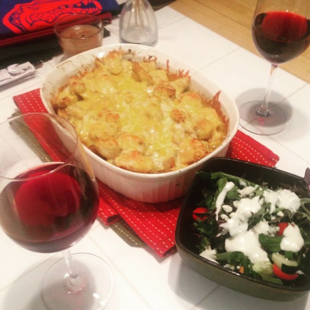 Just in case anyone was wondering, my wine I chose was Leese + Fitch Pinot Noir. It's light enough to go well with the chicken, but also earthy enough to not get drowned by all the bacon and cheese. It's about $10 at your local store and just a really solid wine that goes with so much.