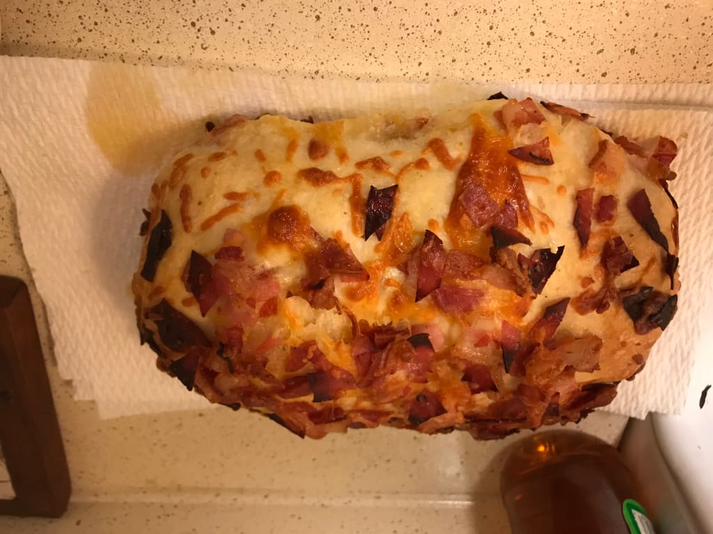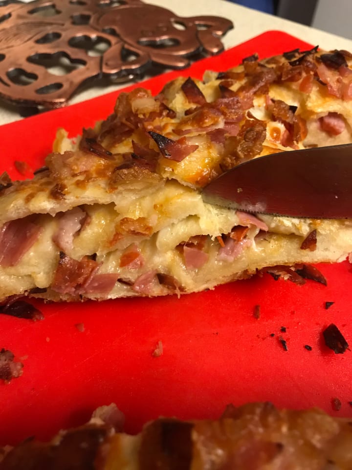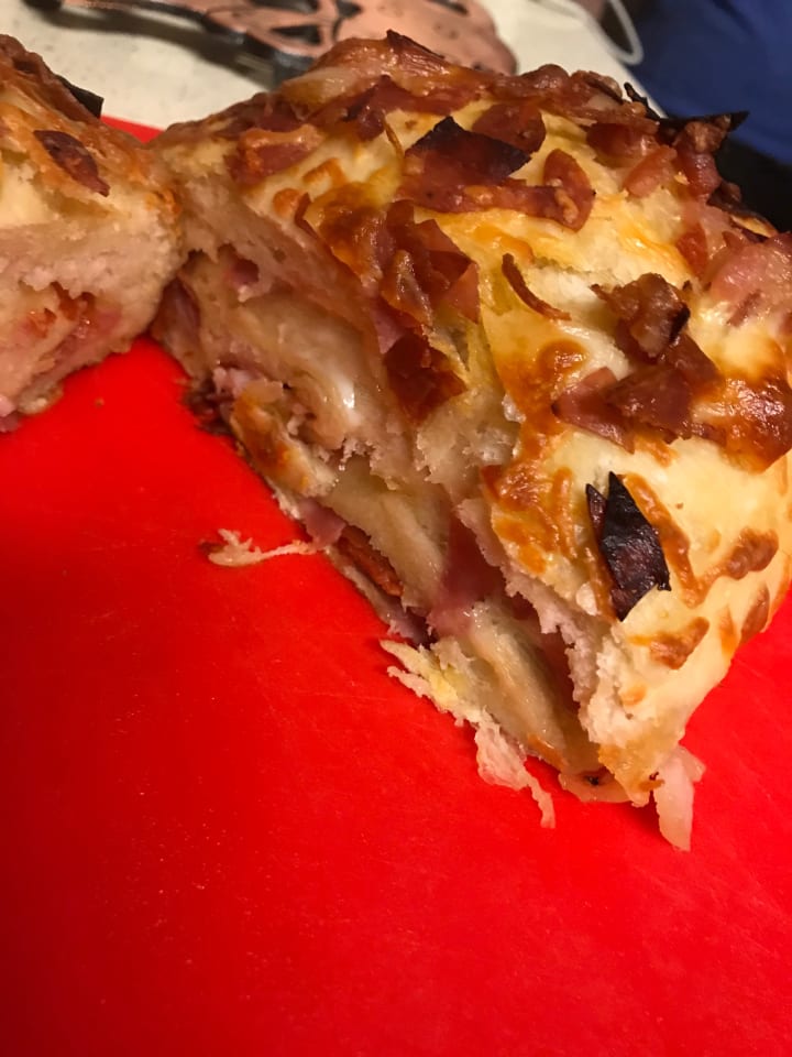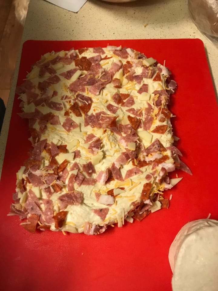 This one is pizza dough, bacon, pepperoni, salami, and cheese.