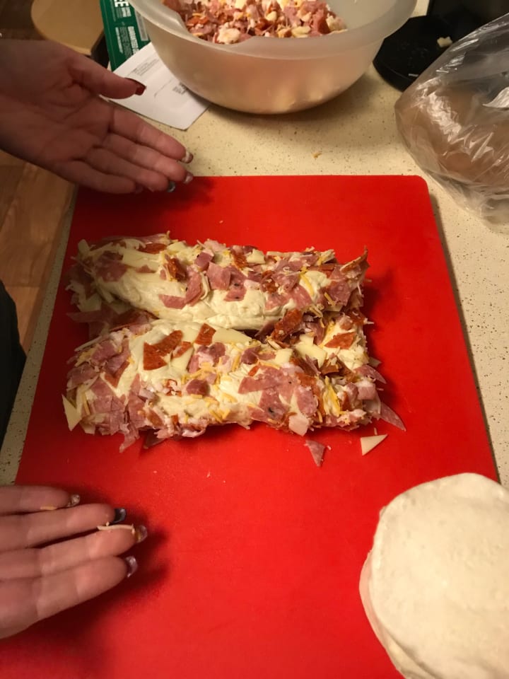 - For the dough, lay out flat, fold in sides then roll up jelly-roll style.
