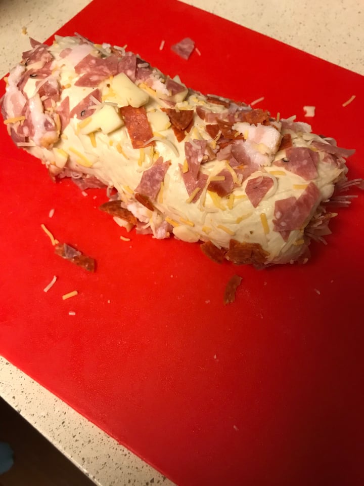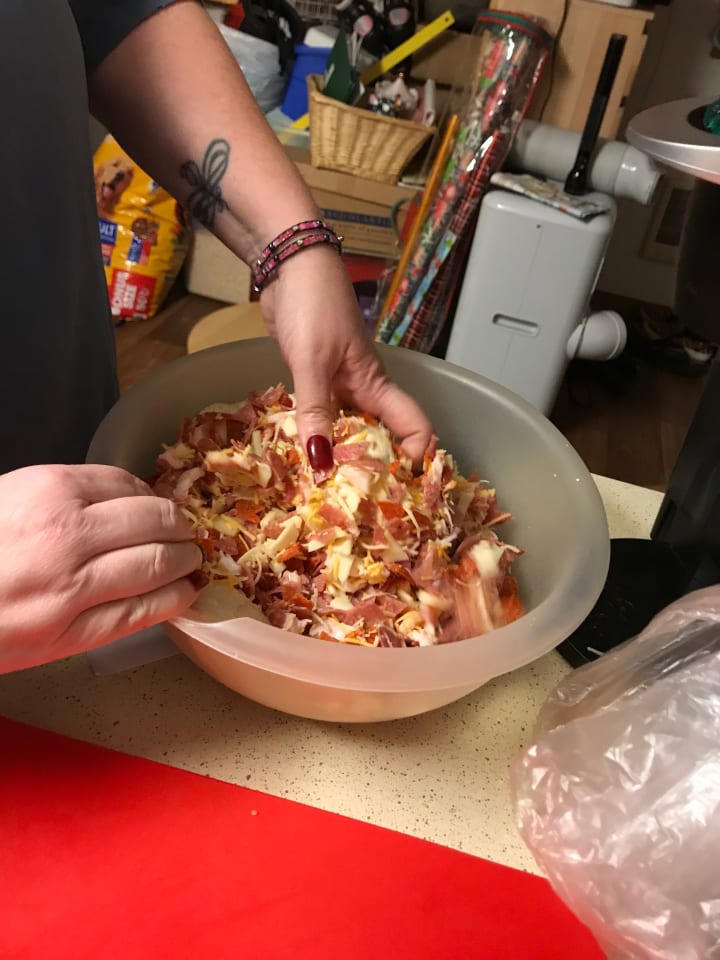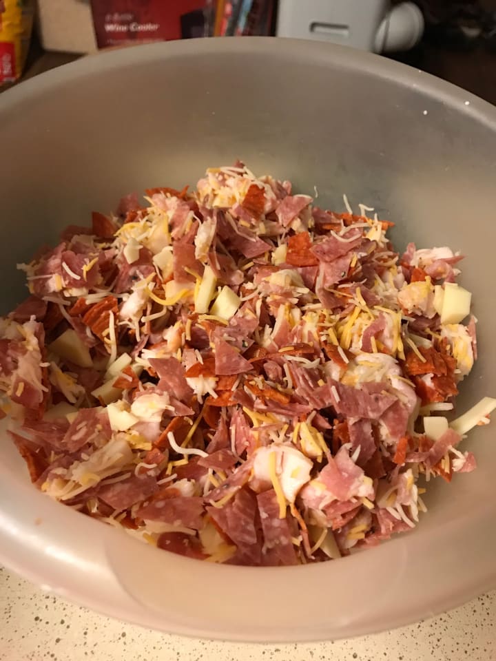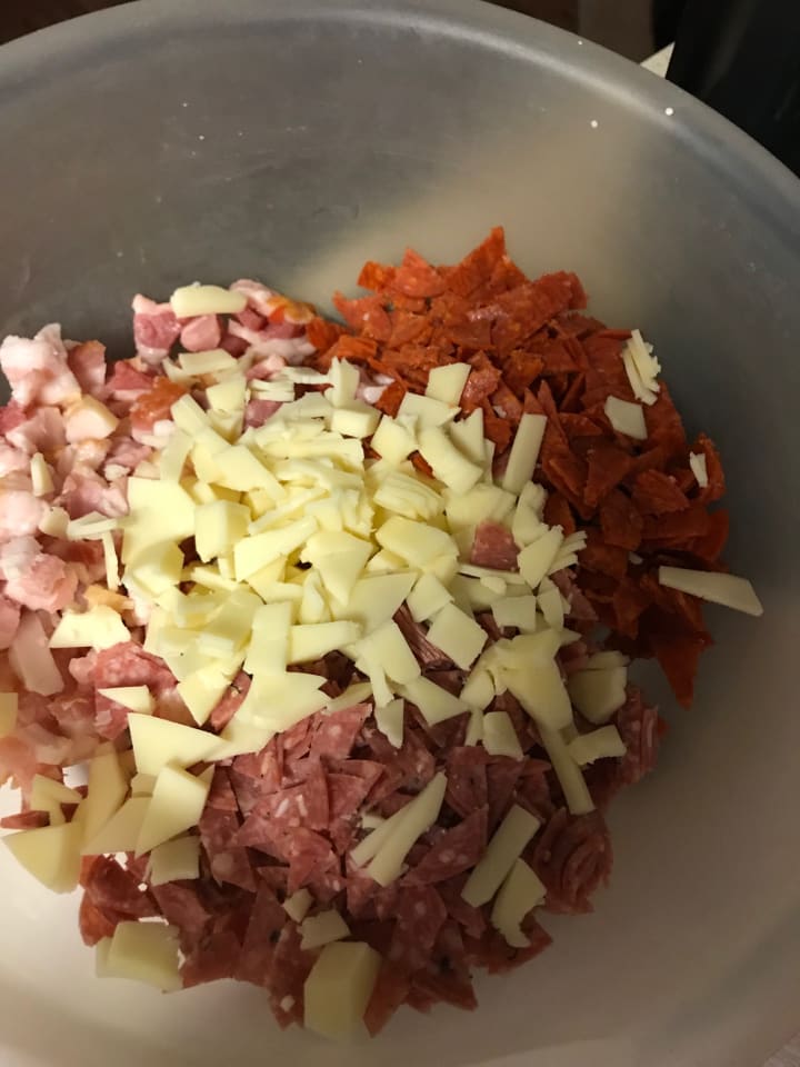 I got a bag of sliced pepperoni (5 oz bag, I used probably 3 oz.), sliced salami (3-4 oz bag), and a big ass pack of thick cut bacon (but I only used 5 pieces of it). I had sliced provolone at home so I didn’t buy any but once I got home I found it was almost gone. CRIKEY! So I added some shredded cheese mix.