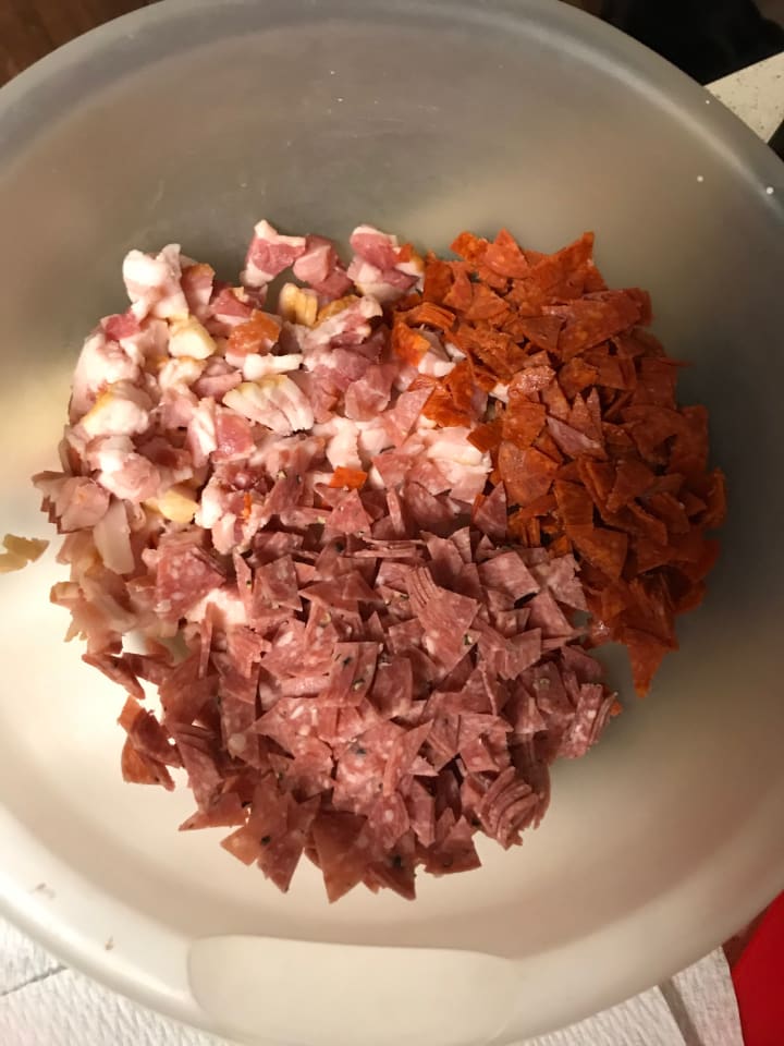 I did not have precise measurements so I cut up what looked like equal amounts of each meat. The recipe below is for using just enough for the amount of pizza dough (12 oz) in the recipe.