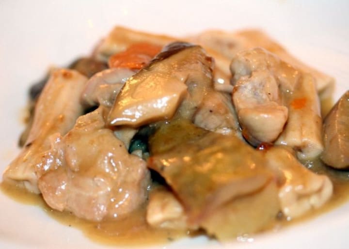 The dish is prepared with leftovers like peeled crests, rooster wattles, sweetbreads, cal's brain and veins then simmered slowly with garlic, rosemary, bay leaves, chopped vegetables marinated in vinegar, chicken broth, and sweet Marsala wine. It can be served on its own or accompanied by risotto.