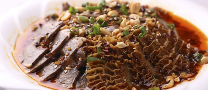 Sichuan Fugi Fei Pian has become a popular snack in Sichuan cuisine. The dish is prepared with shavings of beef mostly offal that are doused in a very spicy sauce. Typical ingredients are beef heart, head skin, tongue, and tripe that are cooked then sliced thinly. After the meat and spicy sauce are ready the dish is arranged first with fresh celery topped by the shavings, then the beef soup is poured over and then the sauce tops everything. The sauce includes chilli oil, sesame seeds, and Sichuan peppercorns.