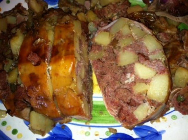 Hog Maw also called Susquehanna turkey or Pennsylvania Dutch goose is a traditional New Year's Day dish for many Pennsylvania German families. The dish is made with a pig's stomach stuffed with cubed potatoes and loose pork sausage along with cabbage, onions, and spices. The hog maw was traditionally boiled but can be baked or broiled and then seasoned with butter before serving and topped with horseradish or stewed tomatoes.