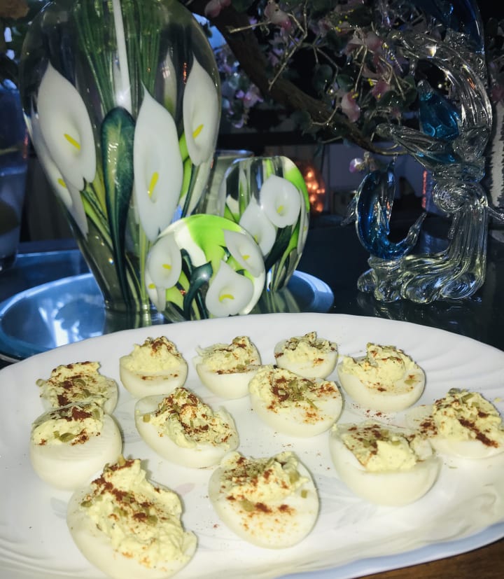 - After scrooping out the egg yolks combine with the rest of the ingredients slowly adding Mayo/Veganise as needed for a good even consistency. Careful not to add too much. Than spoon out and fill thecut open egg whites and sprinkle paprika and chives on top for taste.