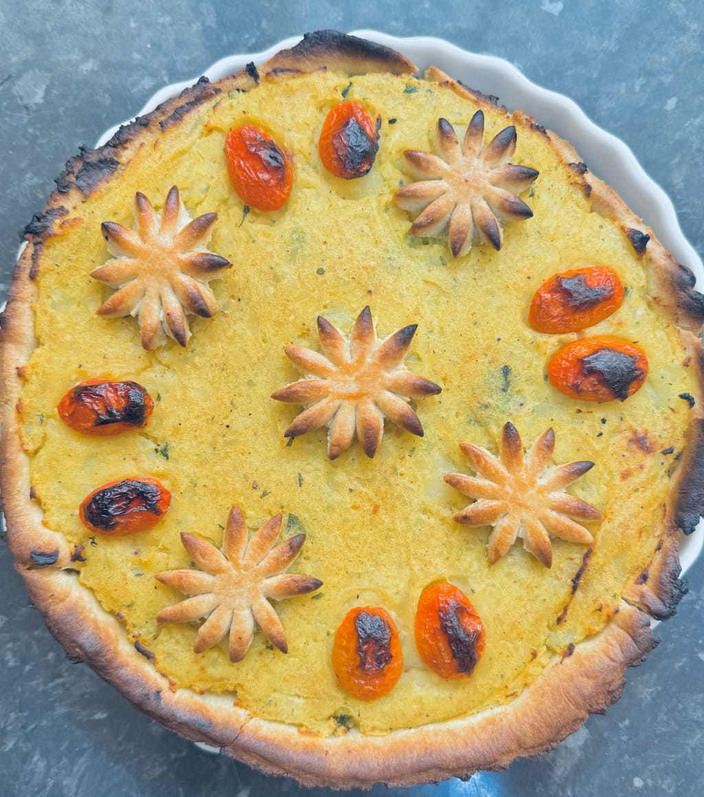 - Remove your baking beads or tin from your pastry and fill with the potato filling, evening it out with a spatula