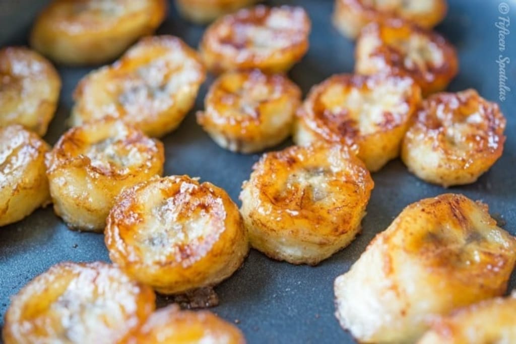 - The aroma of the warming bananas will start to fill the air and make it known that it’s time to flip them. They will be glazed to the pan and might even stick a little, even with a non-stick pan, this is the natural sugars coming out of the banana.