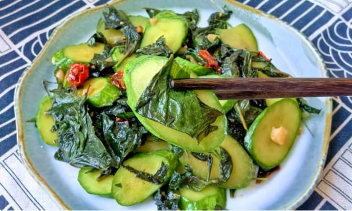 2. Sauté garlic and chilies in hot oil until fragrant. Add cucumbers with a satisfying sizzle and stir-fry briskly.