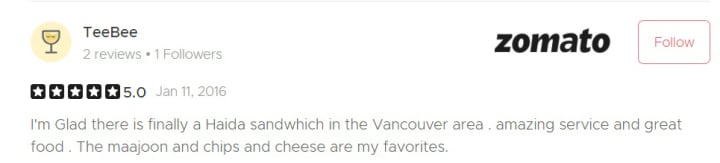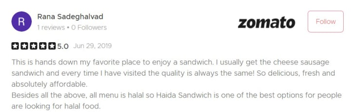 Every time you can try tasty and large sandwiches for reasonable prices! Haida's special sauce is excellent. Great food and even better service. Small restaurant but make up for in quality and portion size.