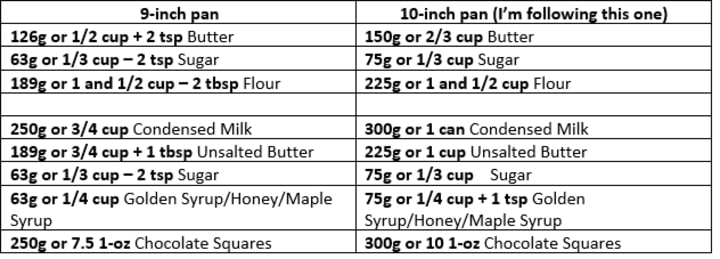 I’m using a 10-inch square pan so if you have a 9-inch, use the chart below to convert. The main recipe is for an 8-inch pan. If you don’t want to convert, you don’t have to. Warning, math ahead.