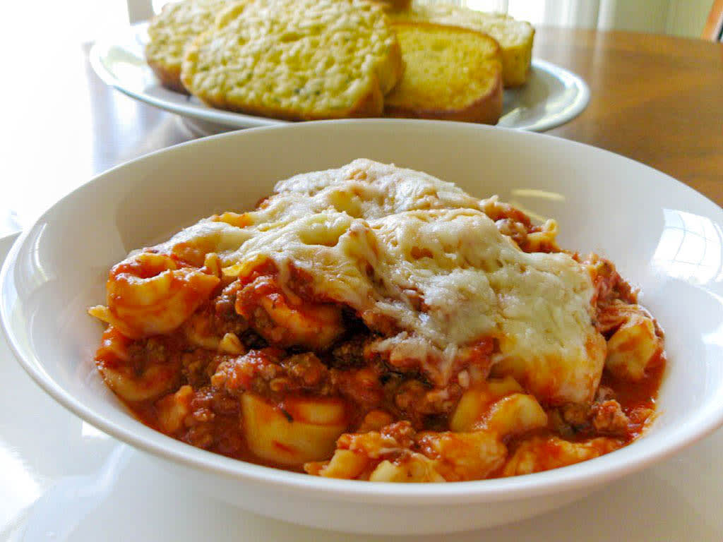 - Top it with the meat sauce mixture, then another layer of tortellini, and then a final layer of the meat sauce mixture.