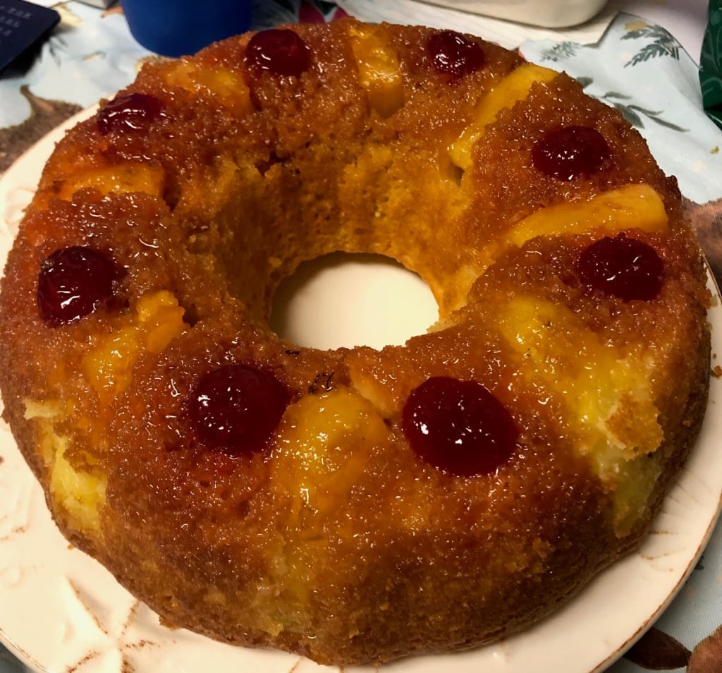 I recall watching in awe as my mother removed the cake from the oven, and made the ever-so-careful attempt to invert the bundt pan. I held my breath in eager anticipation and watched in bewilderment as the confection slid perfectly from it's inverted platform onto the serving platter. My eyes widened, the blue hues sparkling when I beheld this magic. What I saw was amazing! There were ringlets of mouth-puckering pineapple, with ruby, plump maraschino cherries adoring the centers.