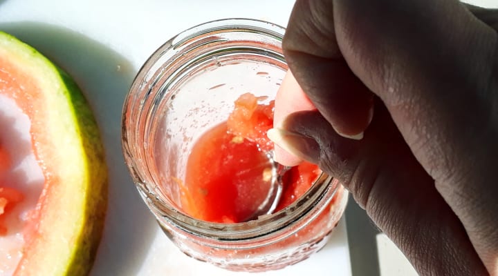 Once all the seeds are out, fill your cup about halfway with watermelon chunks and use the back of the spoon to mash them up. Like this: