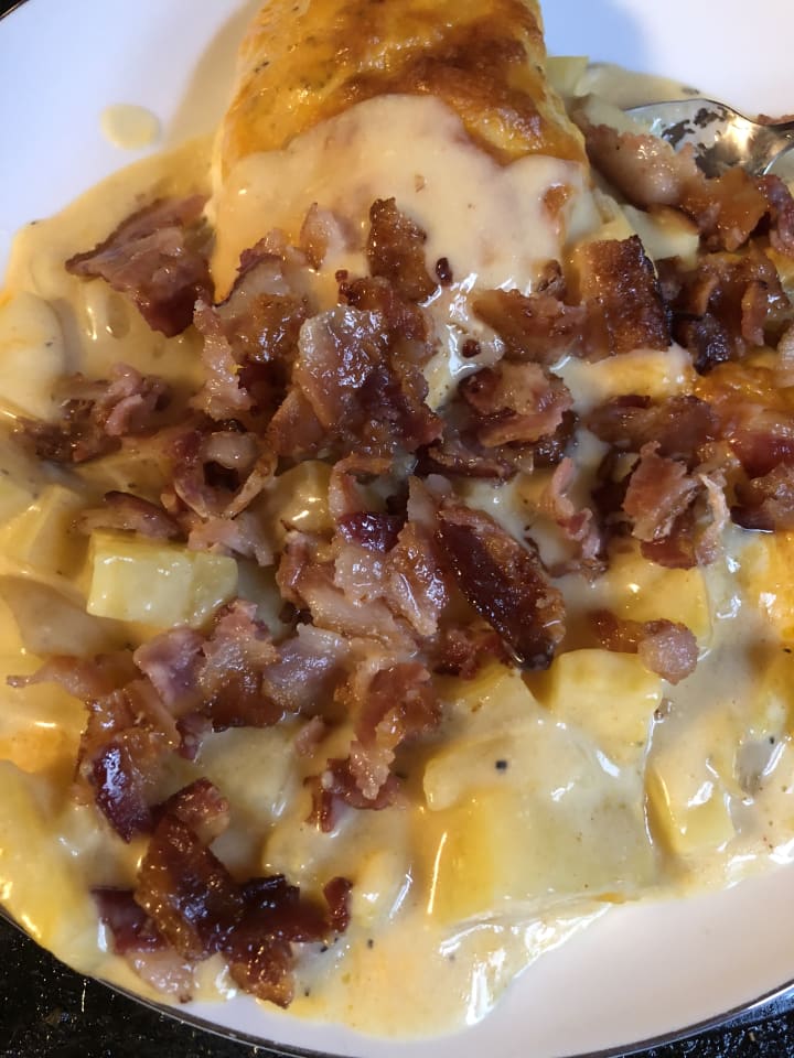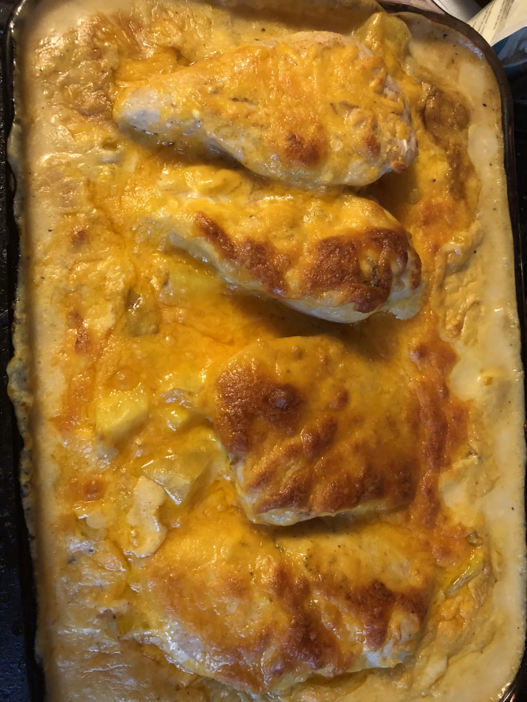Next, brown chicken with seasonings you like or just use Lawry’s and fresh garlic minced. Take the chicken out and put in a bowl on the side. Afterward in same pan mix cans of cream of chicken with spices* and two cups of water or milk and mix well. Then you pour mixture over potatoes.