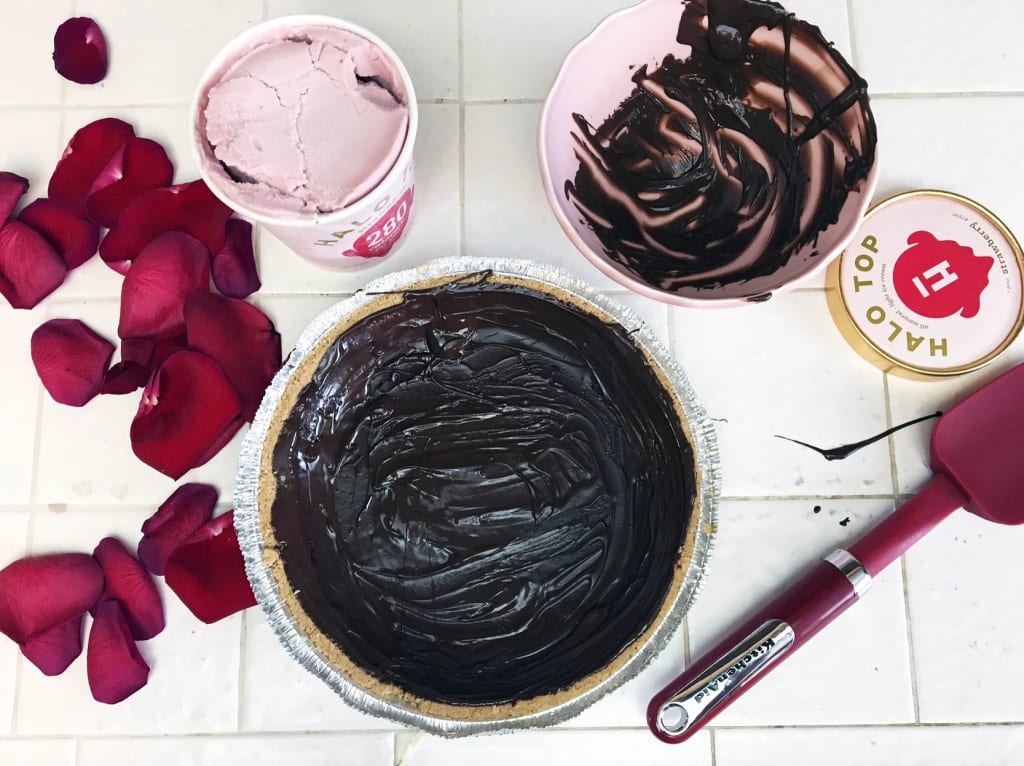 • Next, spoon the softened ice cream into the pie, smooth over the top until it's flat. Place back in the freezer for 20 minutes, or until ready to serve.