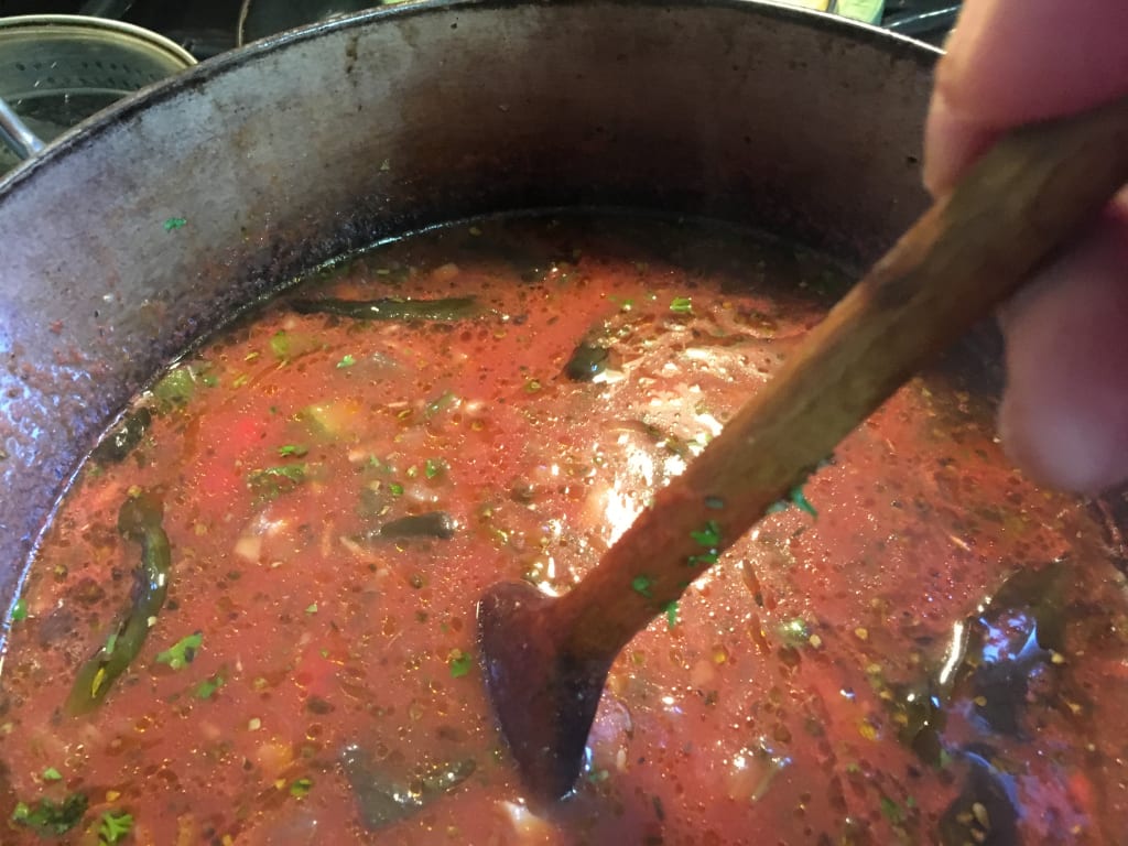 Awash with scents of salt and rosemary, fresh basil and ripe Roma tomatoes, crushed garlic and parsley, and fish, glorious fish, this broth stirs you, seeps deep inside you, softly settling; the foundation of all life, the sea.