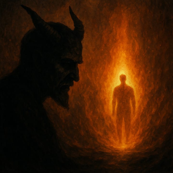 Then one day, a fire unlike any he had ever seen—though he himself was born of fire—flared before his eyes, and in that blaze, Satan saw the truth: