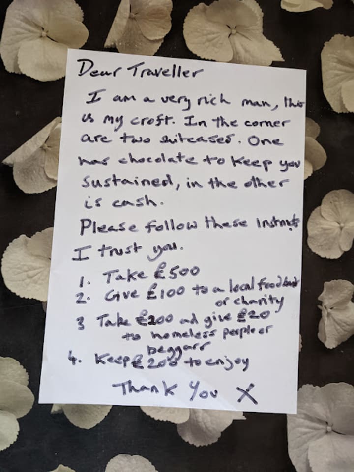 The door was unlocked and inside it was light as there was a window. There was a fireplace with logs so this could be a place of shelter if needed. They they saw a note blu tacked to a table, this is what it said.