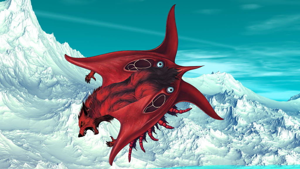 The Observer's eyes had no whites; they were simply two glowing red points in the dark. His face, which a human might describe as unmistakably wolf-like, was covered in luxuriant red fur. An elegant, black-tipped nose — moist with his breath — and a long lipless mouth with a double row of white teeth completed his visage.