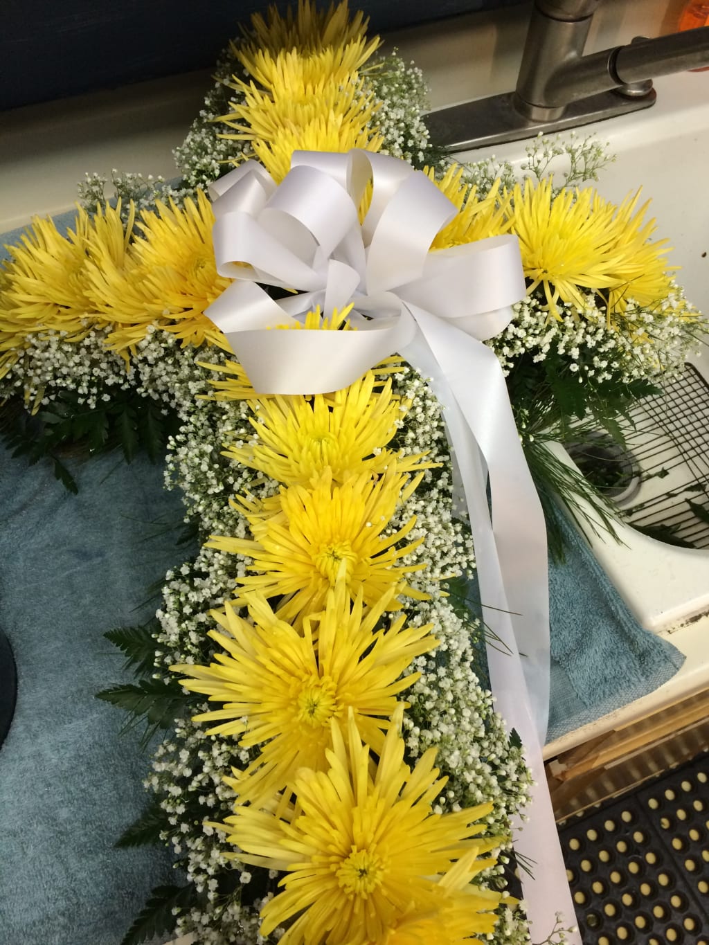 The cross was the standard design Mr. Capuano sent for funeral services for his friends and clients. The 30” Styrofoam cross generally took eighteen stems of fugi or football mums to make the shape. One bloom per water tube inserted and aligned in the precut Styrofoam. After the fugi mums were in place, lemon leaf, or laurel, or whichever greens were available would be fresh cut and inserted directly into the sides of the cross to give it a wider form.