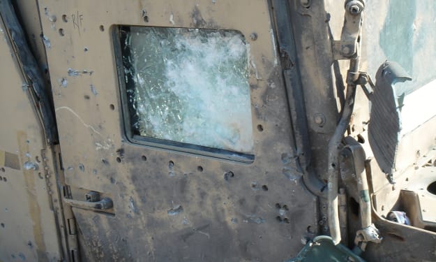 “Sorry sir,” muttered Con and sighed as he noisily unbuckled his seatbelt and opened the thick, heavily armored door. As the driver stepped out of the vehicle, scarlet gore exploded from his thigh. Lieutenant Adamson remembered hearing the shot and the hideous buzz of the sniper’s bullet ending in a wet, fleshy smack! only after it had done its terrible work.