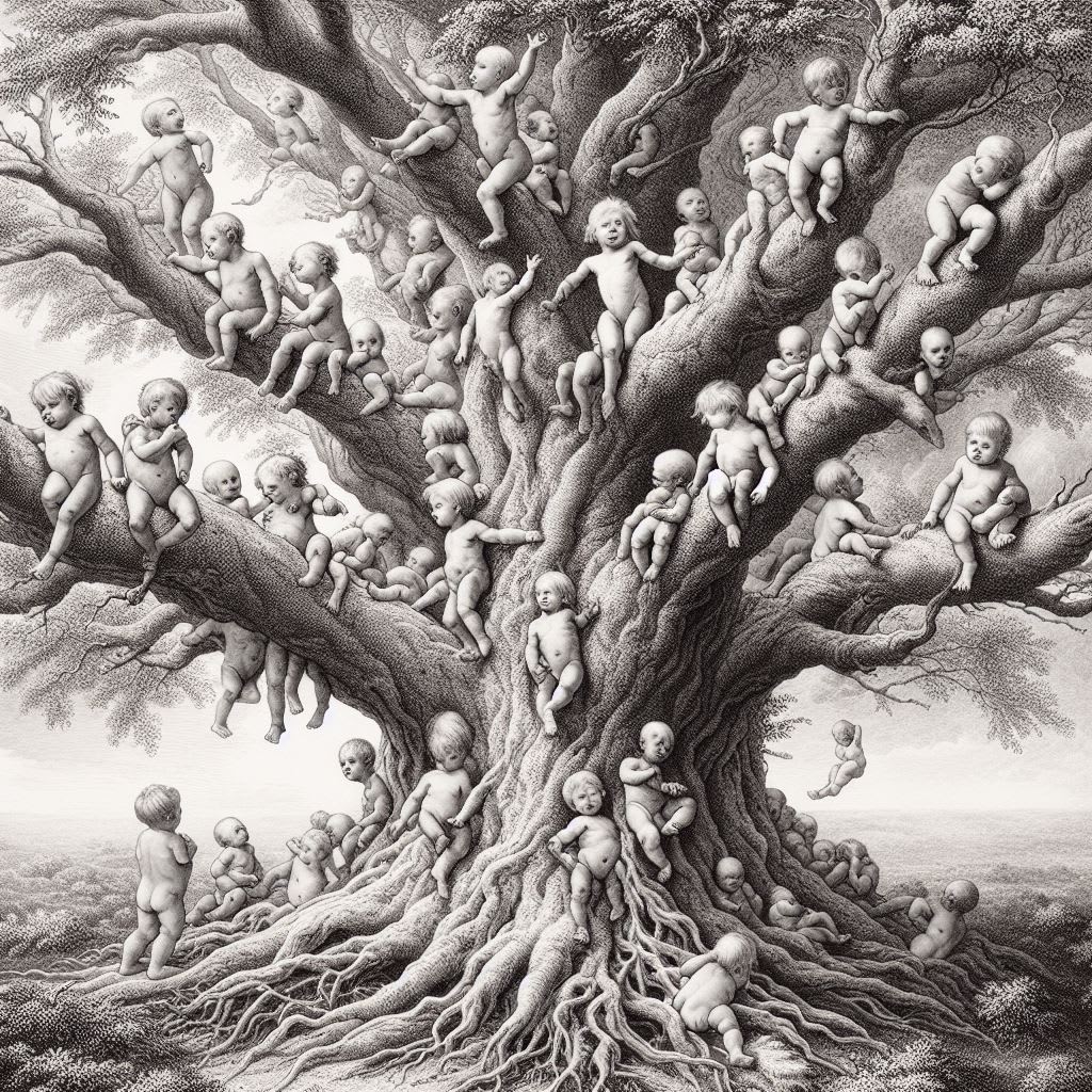 From its smoldering branches an infant.