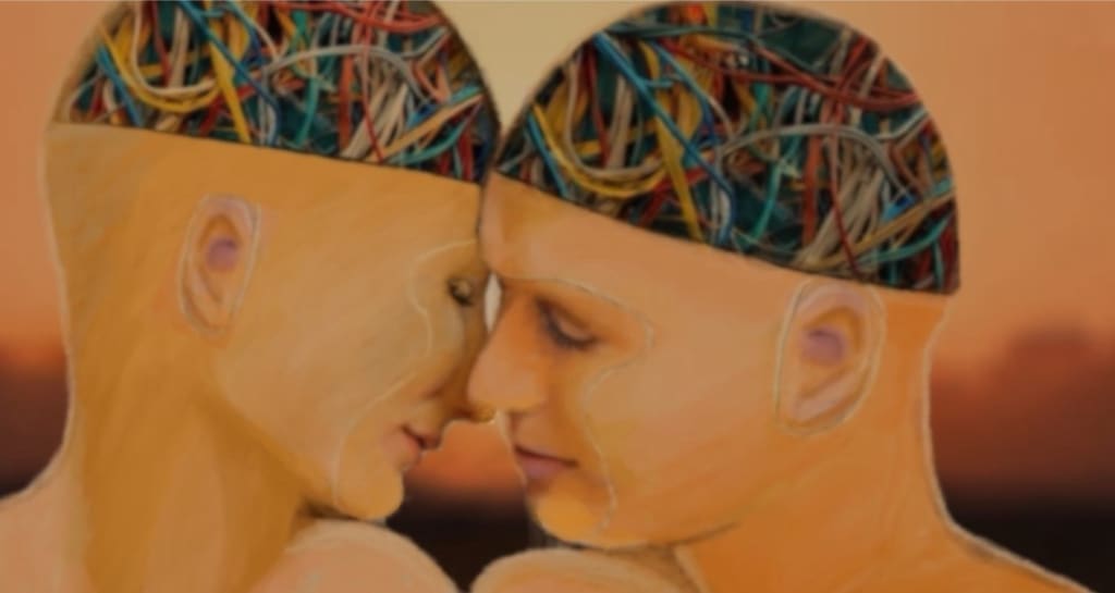 They stood in the light, touching one another, surprised at the new feelings generated, but for which they did not have language. As the minutes and hours passed, they explored each other's bodies like innocent children, sometimes giggling with surprise, at others shocked by the strange desires triggered within their flesh-covered mechanics.