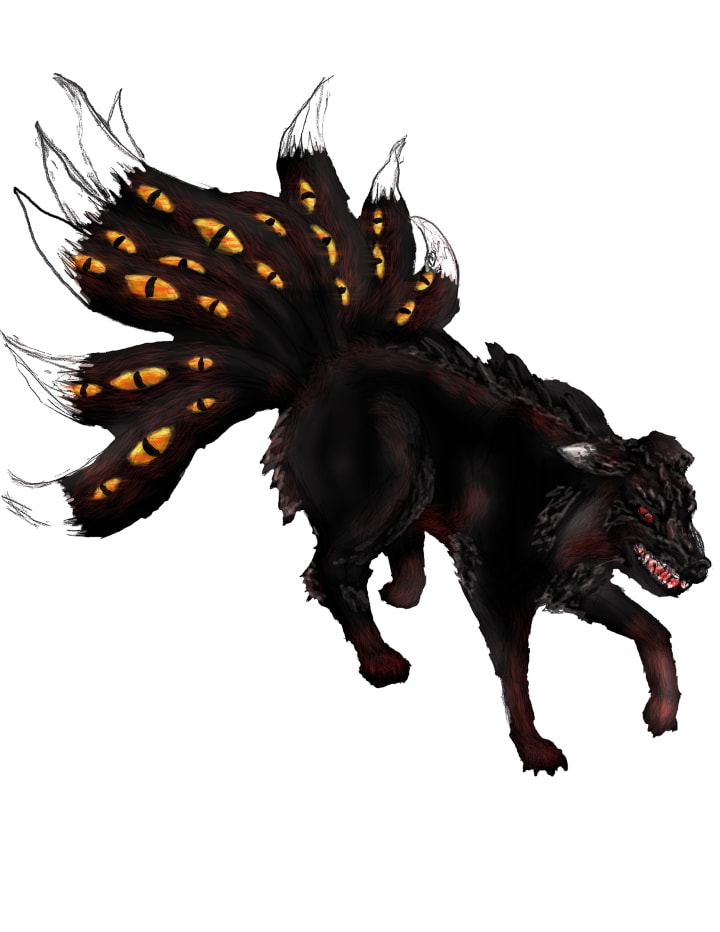 Finally settled into his new throne, Hotin, the Vulpine Prince of Nightmares, grinned eagerly as one of his vulpine lycanthropes, a werefox, announced that Huli, the sister of the former Queen Sora Tsuki, had been captured. Standing to all four legs and displaying his 9 black tails with monstrous yellow eyes glaring out from each one, he took a stance of power.
