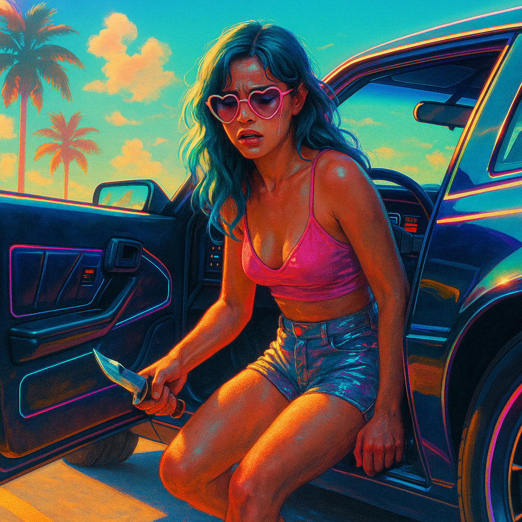 As Sarah slashed downward to complete the R in her name, the blade of the Rambo knife cut through the polyurethane and emerged with a downward arc, continuing into Sarah’s tanned thigh, sinking an inch deep into her flesh. The knife’s thickness stood prone, stuck inside her, emerging from her like a stake in the ground, marking the next tragic casualty that summer in Sonoma County. As she paused in silence, taking in the sight of the knife penetrating her, she heard both the doors of the Trans Am slam shut with a violence that sounded like an explosion, the force from them closing creating a soft blast of air that puffed on her tearstained cheeks. She jumped in shock, letting out a scream, and heard the locks snap into place.