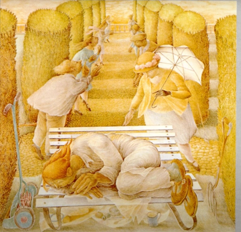 That was all that he did, mow the lawn. And when he had finished, he made a cup of tea, drank it, and then lay down on the bench in the tree-lined avenue for an afternoon nap.